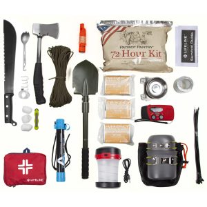 1 Sturdy Backpack, 1 Shovel/ Pick, 1 Hatchett, 1 Machete, 1 72 Hour Food Pack, 1 Pocket Water Filter, 1 Collapsible LED Lantern, 1 AM//FM Radio, 1 Cooking Pot Set, 1 Portable Folding Stove, 1 One Hand Fire Striker, 1 Fishing Kit, 1 Titanium Spork, 1 5-in-1 Whistle, 3 Survival Blankets, 1 Paracord – 100ft, 1 Roll Duct Tape 2″ x 30’, 3 Cotton Tinder, 10 Cable Ties, 1 Survival Guide, 1 First Aid Pouch, 1 2” X 3” Moleskin, 5 3/8” X 1-1/2” Bandages, 10 3/4” X 3” Bandages, 2 Knuckle Bandages, 5 Butterfly Bandages, 2 Alcohol Prep Pads, 2 Iodine Prep Pads, 2 Sting Relief Pads, 2 2” X 2” Sterile Gauze Pads, 2 3” X 3” Sterile Gauze Pads, 2 3” X 4” Non-Adherent Dressings, 1 1/2” Adhesive Tape Roll, 2 Antiseptic Towelettes, 1 Hydrocortisone Cream, 2 Triple Antibiotic Ointment, 4 Acetaminophen Tablets 325 mg, 4 Ibuprofen Tablets 200mg, 1 Tweezers, 2 Vinyl Gloves, 3 Cotton Tipped Applicators, 1 First Aid Guide